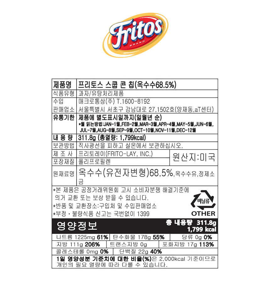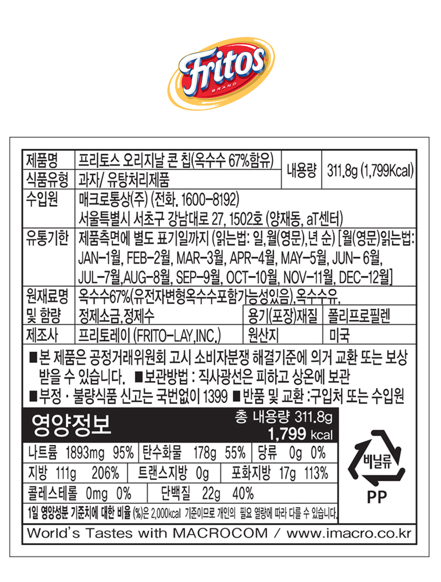 미국 프리토스 콘 칩 오리지날 옥수수칩 옥수수과자 311.84g