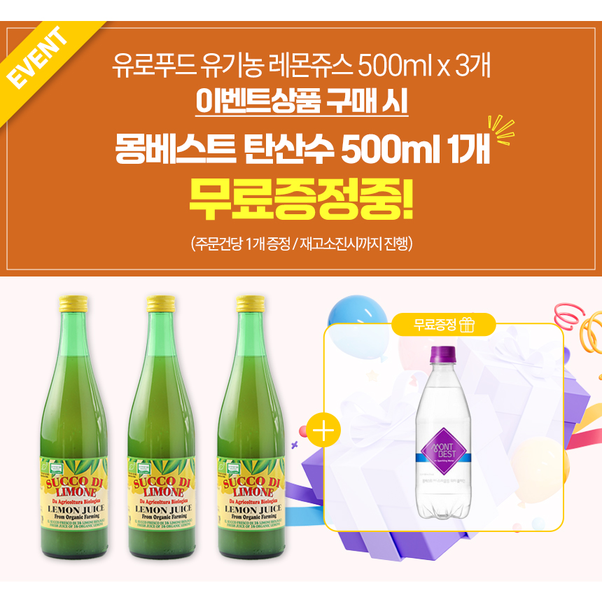 유로푸드 유기농 100% 레몬쥬스 500ml 3개 레몬즙 착즙주스 차 (탄산수 1개 드림)